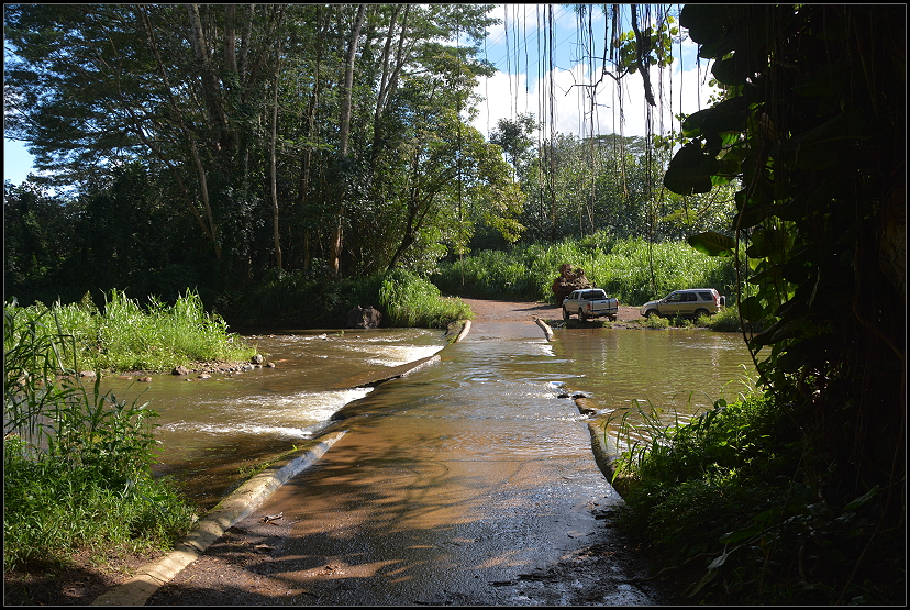 Die Weiterfahrt zum Park war wunderschön. Es war kaum Verkehr auf der Straße, rechts und links kleine Häuser, Hühner liefen auf der Straße herum und je weiter wir fuhren, desto dichter wurde der Wald um uns herum. Nach der Durchfahrt eines Flusses kamen wir am kleinen Park an und stiegen aus. Die Luft draußen legte sich wie eine dicke Wolldecke um uns herum. Puh…!