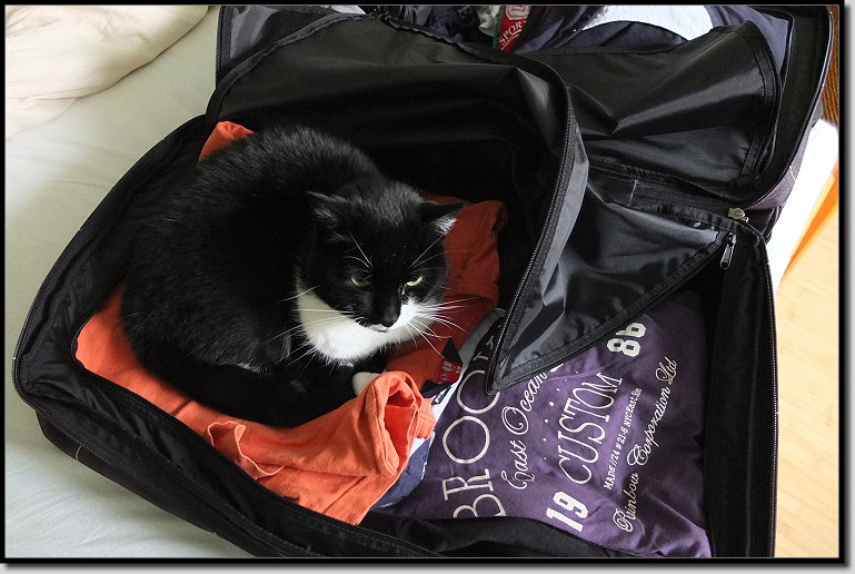 Als der Abreisetag immer näher rückte, beäugte ich kritisch den Wetterbericht, der sagte nur 15°C und einen Sonne-Wolken-Regen-Mix voraus. 15°C? Was sollte ich bloß in den Koffer packen? 10°C = kalt! 20°C = warm! Aber 15°C?? Zudem schien in Sprockhövel bei sommerlichen 25°C die Sonne vom blauen Himmel und ich hatte keine Lust auf eine Jacke. Mmmh, letztendlich entschied ich mich für T-Shirts, dünne Pullis, Steppweste und Katze. Katze??? Lag doch tatsächlich unser Fellbündel zwischen den Sachen im Koffer! Unfassbar! „Schatzekatze, du kannst nicht mitfliegen, also raus!“ |