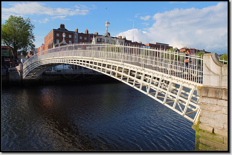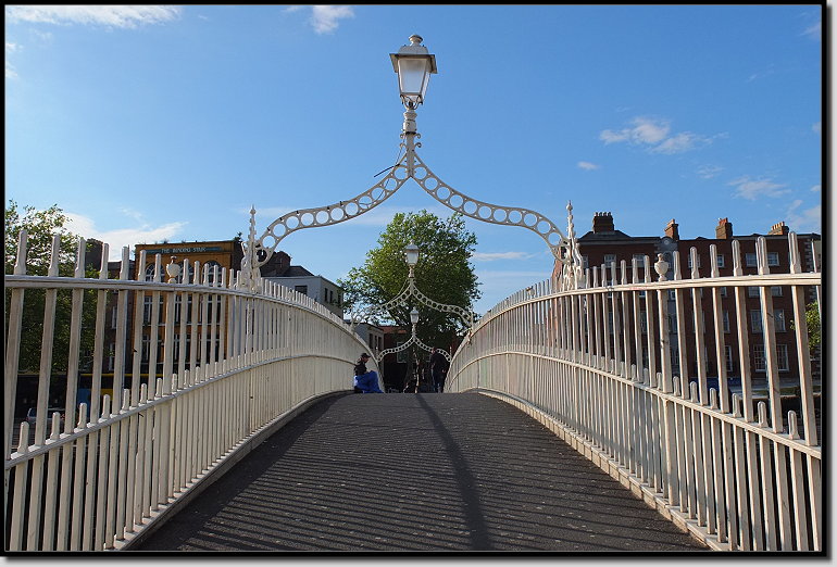 An der Ha`penny Bridge legten wir einen Fotostopp ein. Die schöne weiße gusseiserne Brücke ließ 1816 William Walsh errichten, weil seine dort eingesetzten Fährboote in einem desolaten Zustand waren und die Stadt ihn vor die Wahl stellte. Entweder würde er seine Nussschalen rundumerneuern lassen oder er würde eine Brücke bauen. William entschied sich für Letzteres und verlangte einen halben Penny Maut, von jedem, der die Liffey überqueren wollte. 1919 endete schließlich die Mautpflicht, aber der volkstümliche Name blieb.
