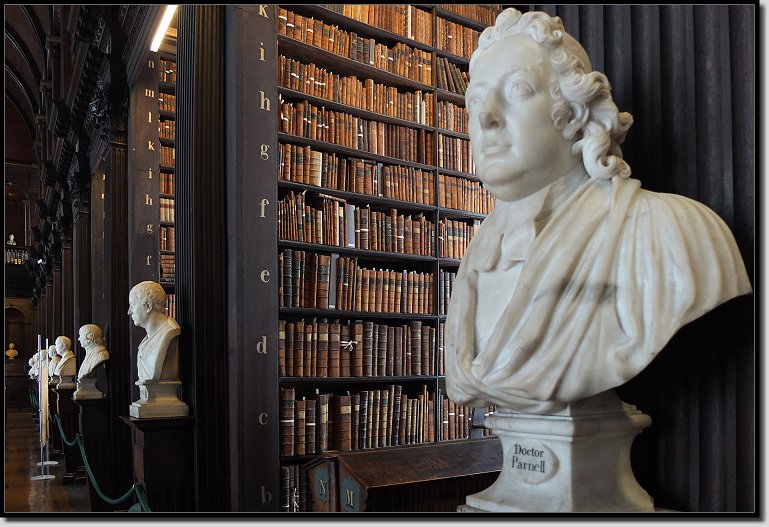 Die Hauptattraktion auf dem Gelände ist die alte Bibliothek. Neben 200.000 alten Büchern kann man das Book of Kells und die älteste Harfe Irlands dort bewundern. 15 Minuten vor der Öffnung stellten wir uns in der kleinen Schlange vor dem Eingang an. Kurze Zeit später tauchten aus dem Nichts zwei riesige Reisegruppen von einem Kreuzfahrtschiff auf und die Menschenschlange hinter uns hatte sich schlagartig vervielfacht!! Den ersten Teil der Ausstellung durchliefen wir dann recht schnell und hatten so das Book of Kells für uns ganz alleine. Leider durfte ich es nicht fotografieren. Es ist ein wenig schüchtern und empfindlich.