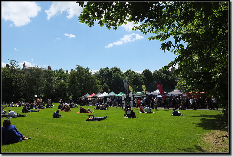 Am Merrion Square hörten wir Musik und bogen ab in den Park. Jeden Donnerstag findet dort zwischen 11:30 – 14:00 Uhr der Irish Village Markt statt. Ach, was für ein Glück, hatten wir doch beide Hunger. Auf einer Parkbank ließen wir uns nieder, lauschten der tollen Livemusik, genossen die Sonne und schlemmten allerlei Leckereien.