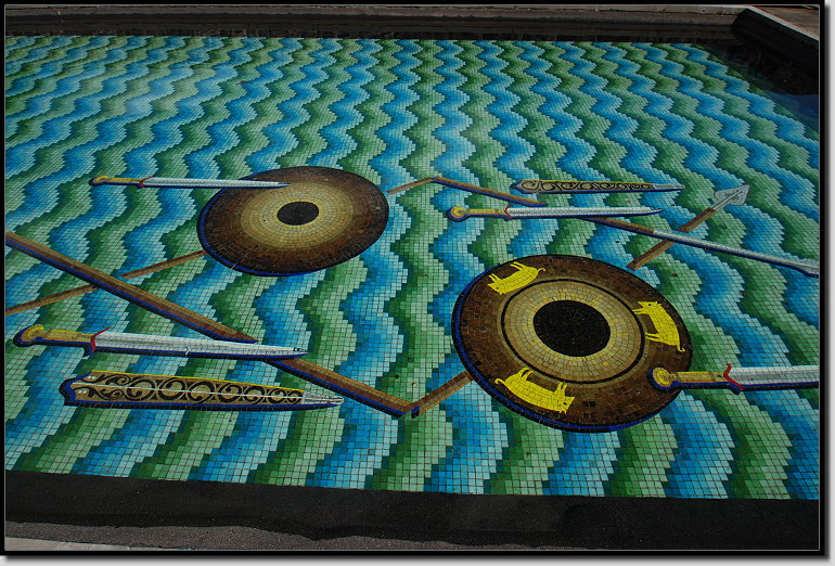 Nach dem Krieg die Waffen zu zerbrechen und in einem Fluss zu versenken, ist ein alter keltischer Brauch und genau daran soll das Mosaik auf dem Grund des Beckens erinnern.