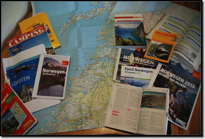 Mitte März begann ich damit, mich in diverse Reiseführer einzulesen. Zudem bestellte ich das kostenlose Touren-Set vom ADAC und das ebenfalls kostenlose Norwegen-Info-Paket vom Tourismusverband. Zusammen mit einigen Straßenkarten verwandelte sich unser Esstisch schnell in ein chaotisches Norwegen-Vorbereitungs-Lager.