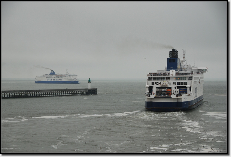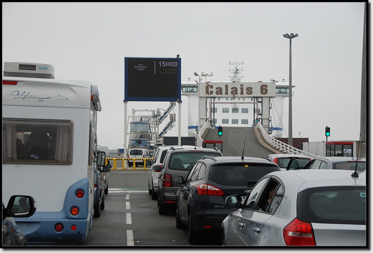 Um 11:46 Uhr kamen wir dann am Fährterminal an und… eine lange Schlange Autos wartete schon vor dem Zollhäuschen. Na toll, hoffentlich sind die fix hier, schoss es uns durch den Kopf. Aber nee, nix fix!!! Die Uhr zeigte 12:01 Uhr und wir standen immer noch in der Schlange und hatten doch tatsächlich die Fähre verpasst!!! Was für ein Mist!! Um 12:10 Uhr waren wir dann endlich dran und zeigten der ziemlich gelangweilten Zollbeamtin unsere Ausweise. Dann konnten wir zum nächsten Häuschen vorfahren. „Ja ja, für die 12:00-Uhr-Fähre sind sie zu spät“, grinste uns der Typ dort schadenfroh an. Blödmann! Er buchte uns dann für die 15:00-Uhr-Fähre ein und kassierte dafür 15 Euro von uns. Das Geld war uns ja noch egal, aber die Warterei und die verlorene Zeit in England…
