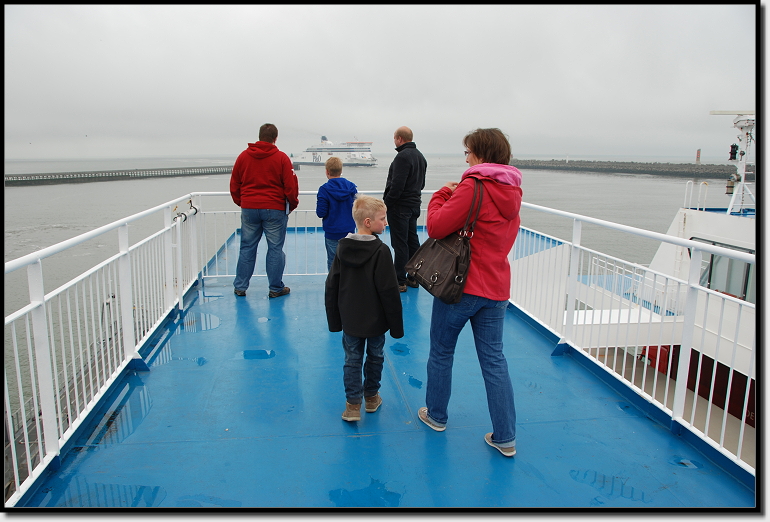 Unsere Autos stellten wir in Reihe, ich glaube es war 23 ab. Dann mussten wir alle erst mal zur Toilette. Sichtlich erleichtert schlenderten wir eine Weile am Pier entlang und verzogen uns dann wieder in die Autos. Ich schrieb schon mal ein wenig den Reisebericht und Tom las. Die Vier hinter uns vertrieben sich auch die Zeit mit lesen und zwischendurch besuchten wir uns gegenseitig. Ein Paar im Auto hinter uns hatte die Fähre auch durch den blöden Stau in Belgien verpasst – geteiltes Leid...