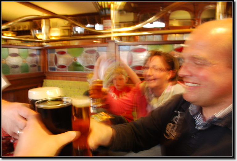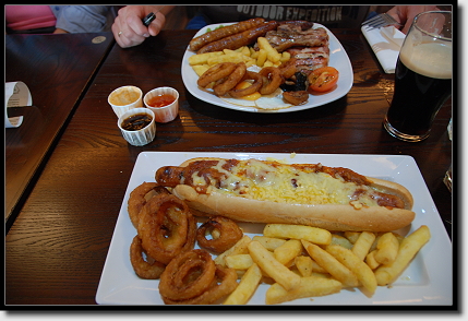 Ein halbe Stunde später trafen wir uns unten im Pub. Die Vier waren schon vor uns dort und meinten, es wäre noch niemand zum Bestellen gekommen. Da hätten sie auch noch lange warten können, in GB kommt in einem Pub nämlich niemand zum Tisch, man muss alles am Tresen bestellen. Guinness, Cider und lecker Essen wurde also an der Theke geordert.