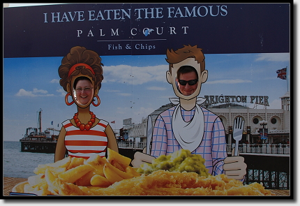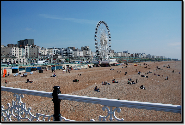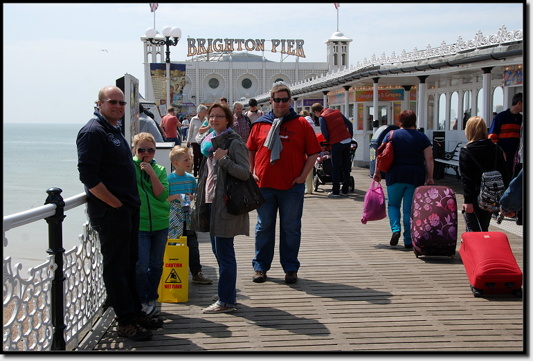 Als wir alles verstaut hatten, machten wir uns bei Sonnenschein (wie es wohl gerade in Erfurt aussah?) auf den Weg nach Brighton. Dort angekommen stellten wir unsere Autos in einem Parkhaus ab (4 £ die Stunde!) und schlenderten zum Meer runter. Dort gab es eine schöne Promenade mit vielen kleinen Lädchen und Imbissbuden. Hier und da stand mal ein Kinderkarussell und am Kieselstrand konnte man sich Liegestühle ausleihen. Es war richtig nett dort. Tom und Nico kauften sich an einem Stand zwei Sonnenbrillen. Nico sah mit seiner aus wie Sunny Crockett… sehr lustig!