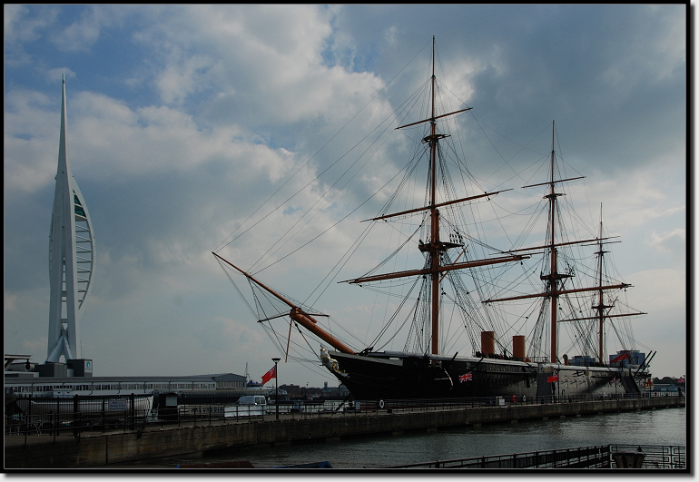 Das Thermometer im Auto zeigte 24°C an und wir cruisten über den Asphalt, leider immer wieder gebremst durch Baustellen oder kurze Staus. Ein bisschen hockte uns die Zeit im Nacken. Um 16:30 Uhr war laut meinem Reiseführer der letzte Einlass für Portsmouth Historic Dockyard. Auf dem Stützpunkt der Royal Navy gibt es eine Menge zu sehen. Dort liegen weltberühmte historische Schiffe, es gibt ein Marinemuseum und es werden Hafenrundfahrten angeboten. Der Eintritt auf das Gelände ist kostenlos, nur wer die Attraktionen besichtigen will, muss zahlen (26 £ pP für alle). Dort kann man sich locker einen ganzen Tag aufhalten. Leider hatten wir nicht so viel Zeit.
