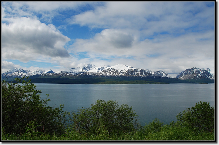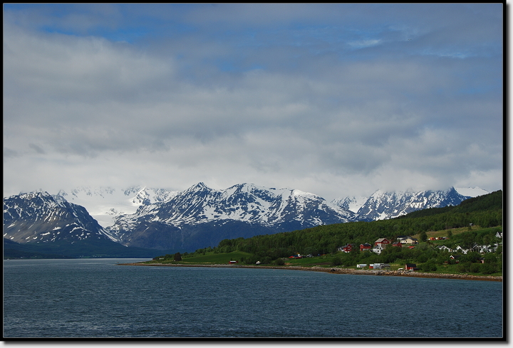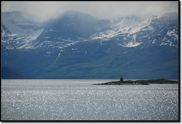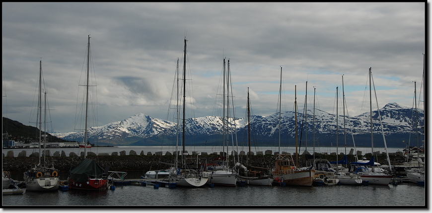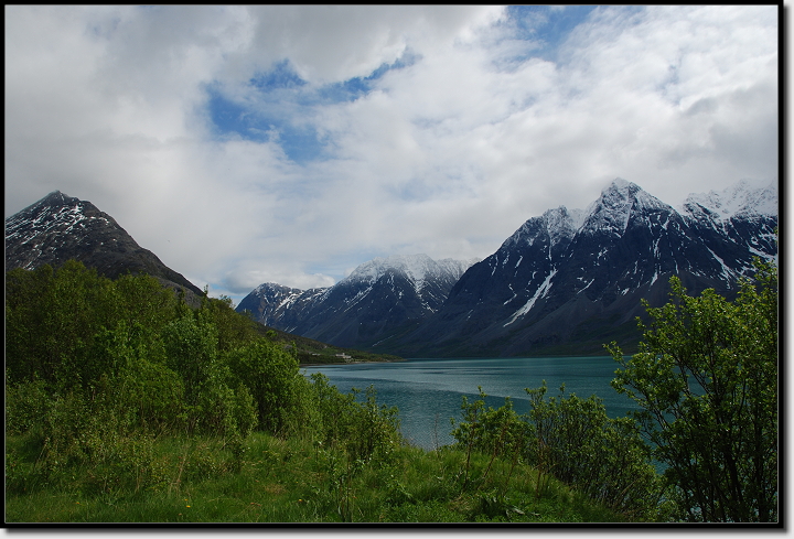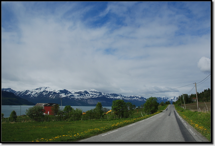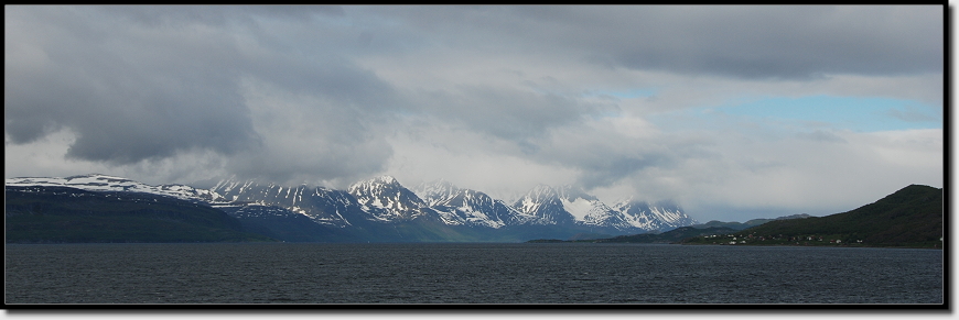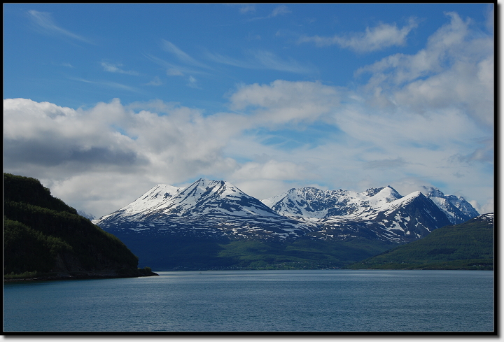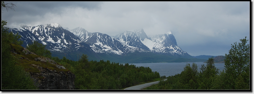 Erst um 9:20 Uhr saßen wir im Auto und fuhren los. Die Wolkendecke hatte einige Löcher, durch die die Sonne schien. Schön, so konnte es bleiben. Gut gelaunt ging es auf nach Tromsø, dem Tagesziel. Die Straße wand sich am Fjord entlang und immer wieder hatten wir neue wunderbare Ausblicke.