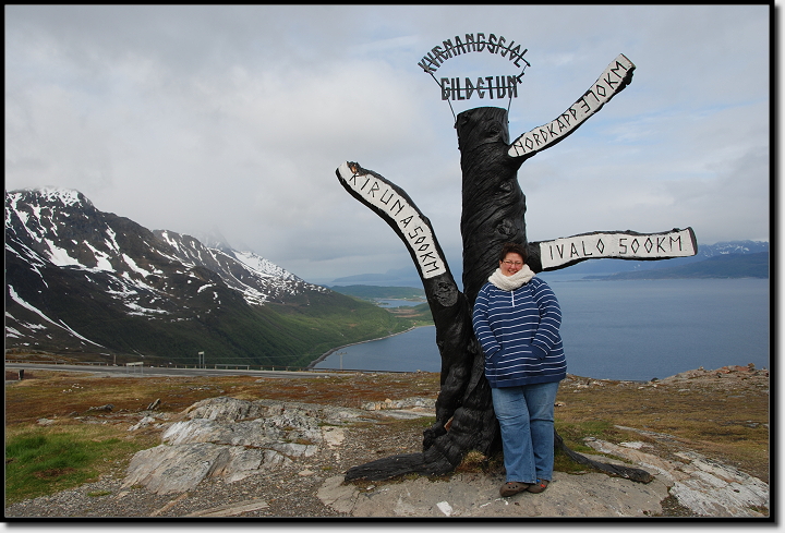 Dann ging es wieder bergauf und die Temperatur fiel von schon fast warmen 9°C auf 5°C. Aber dafür hatten wir einen tollen Blick über den Kvænangenfjord und Tom konnte sich in einem kleinen Café einen Kaffee kaufen.