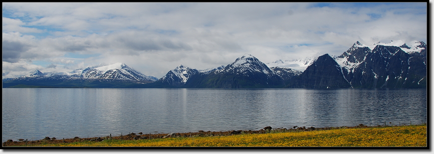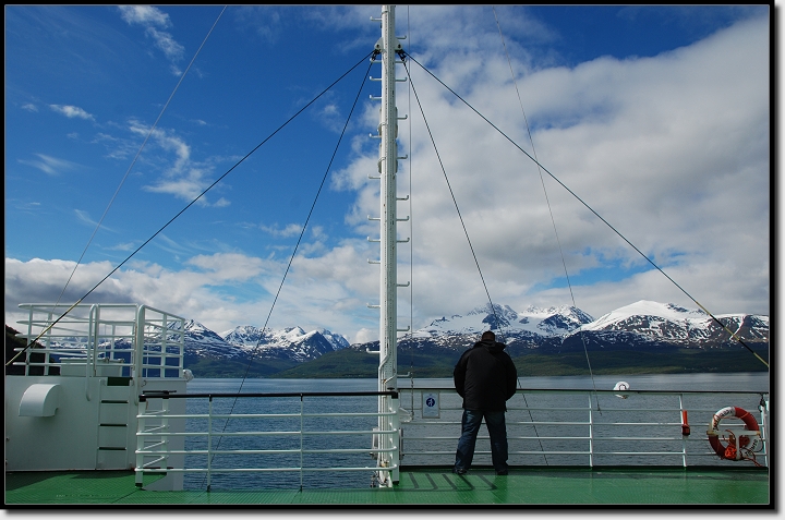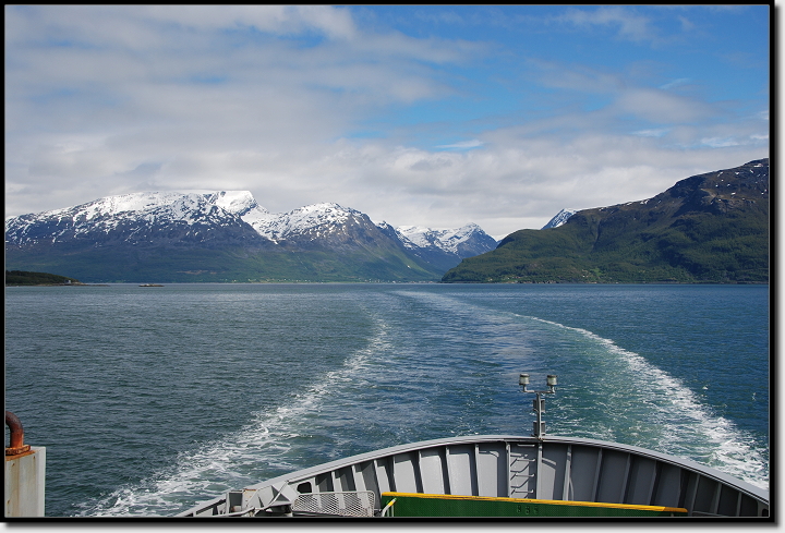 Dann stand unsere erste Fährfahrt an, Olderdalen – Lyngseidet. 160 Kronen (21,30 €) mussten wir hinblättern, bekamen dafür aber eine ca. 40-minütige wunderschöne Überfahrt geboten. Die Sonne schien und der Blick auf die umliegenden Berge war atemberaubend.