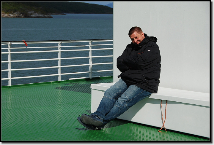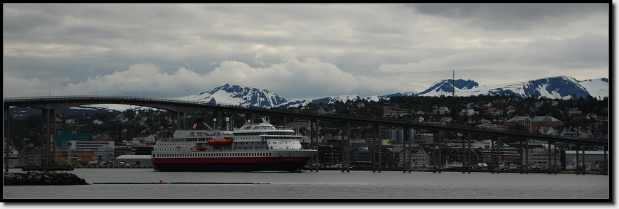 Als wir wenig später wieder die große Brücke, die das Stadtzentrum mit dem Festland verbindet, überquerten, sah ich wie ein Schiff der Hurtigruten auf die Brücke zufuhr. Tom und ich bogen nach links ab und stoppten auf dem Parkplatz eines Holzhandels. Egal, wird schon niemand was sagen. Von dort hatten wir einen tollen Blick auf das Schiff, das unter der Brücke durchfuhr.