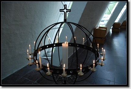Wir traten ein und uns erwartete ein grandioser Innenraum. Ganz anders als in Kirchen üblich. Es gab keine Holzbänke, sondern gemütliche Polsterbänke. Durch die kleinen Fenster an den Seiten und die beiden großen Glasfronten war es ungewöhnlich hell. Ansonsten nicht viel Schnickschnack, alles schlicht und gradlinig. Gefiel uns sehr gut.