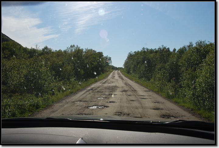 Wir tuckerten über die 82 und bogen bei Myre links ab Richtung Skogvoll. Das erste Stück der Strecke ging ja noch, aber dann kamen riesige Schlaglöcher. Wir überlegten kurz, ob wir nicht mit Vollgas drüber brettern sollten, quasi über die Löcher fliegen, verwarfen die Idee beim Gedanken an unsere Stoßdämpfer aber schnell wieder.