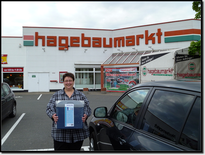 Aber jetzt findet mal, auf der Autobahn fahrend, einen Baumarkt. Einer mit drei Buchstaben tauchte kurz nach einer Abfahrt auf. Zu spät… Nach weiteren 50 Kilometern sahen wir über den Baumwipfeln ein großes „Poco“-Schild. Vielleicht hatten wir Glück und dort gab es auch einen Baumarkt. Also fuhren wir runter von der Bahn und hielten Ausschau. In einem kleinen Industriegebiet tauchte dann doch tatsächlich das ersehnte Geschäft vor uns auf!! Wir fühlten uns, als hätten wir, tagelang durch die Wüste irrend, auf der Suche nach Wasser, endlich eine Oase gefunden. Na ja, vielleicht ein bisschen übertrieben, aber wir waren trotzdem richtig glücklich! Direkt neben dem Eingang standen bestimmt 20 nagelneue graue Kühlboxen. Sie hatten nur leider einen kleinen Nachteil, sie hatten nur einen 12V Anschluss und keinen Stecker für die heimische Steckdose. Egal, wir kauften für 35,- € trotzdem eine.