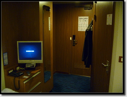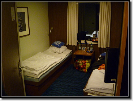 Wir schnappten uns unsere Taschen und gingen schnurstracks zu unserer Kabine auf Deck 9. Schick war die, keine Vergleich zu den Zellen auf den DFDS-Schiffen. Holzimitat und ein Bild an der Wand sorgten für Gemütlichkeit und Tom freute sich besonders über den Fernseher, der schon beim Betreten der Kabine lief.