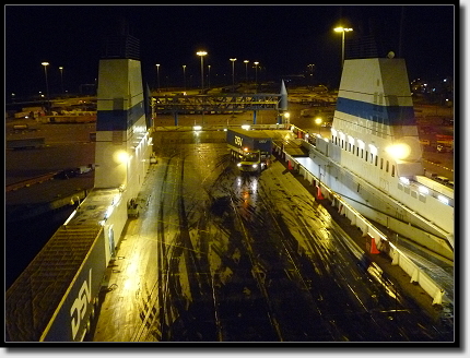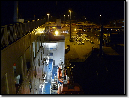 Die Zeit bis zum Boarding vertrieben wir uns mit einem Anruf daheim, Futtern der letzten Sandwiches und einem kurzen Toilettenbesuch. Abpfiff beim EM-Spiel, Deutschland hatte 1:2 gewonnen!!!! Pünktlich um 23:00 Uhr setzte sich der Autokonvoi in Bewegung und wir konnten auf die Fähre fahren. Sofort waren wir von ihrer Größe überrascht. Wie viele Decks es hier gab!! Die Besatzung hatte alles gut im Griff und schnell standen alle Fahrzeuge so, wie es sein sollte.