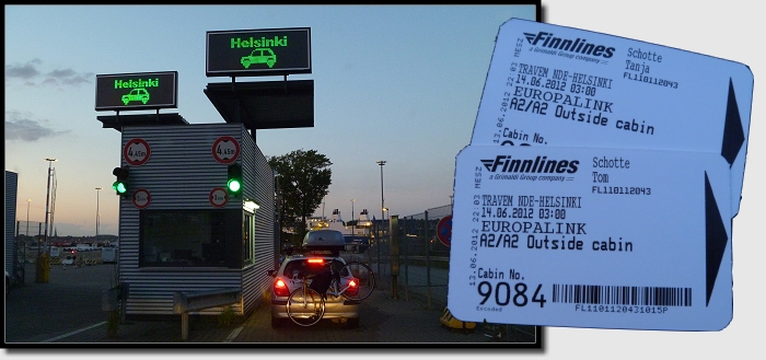 Um Punkt 22:00 Uhr rollten wir auf den Check-In-Schalter von Finnlines zu und nahmen kurze Zeit später kommentarlos zur Kenntnis, dass Holland auf 1:2 verkürzte. Nachdem wir unsere Bordkarten und die Tickets fürs Essen bekommen hatten, reihten wir uns brav in eine der Autoschlangen ein.