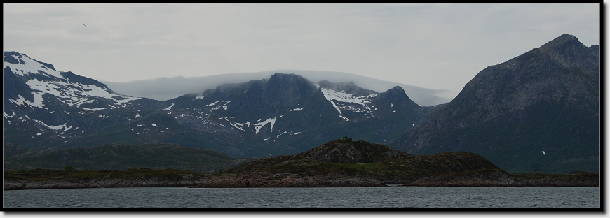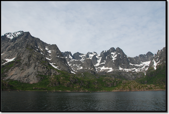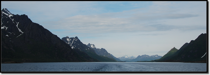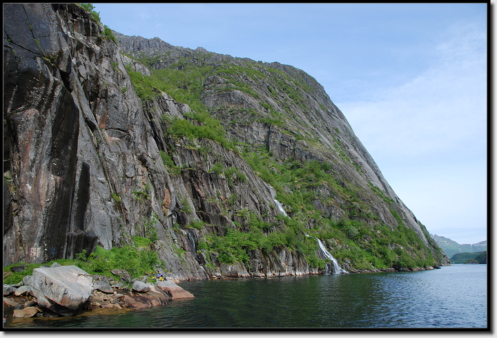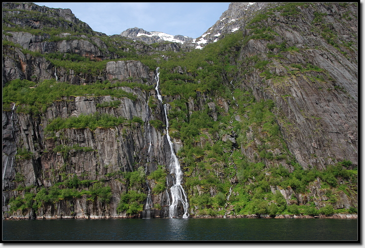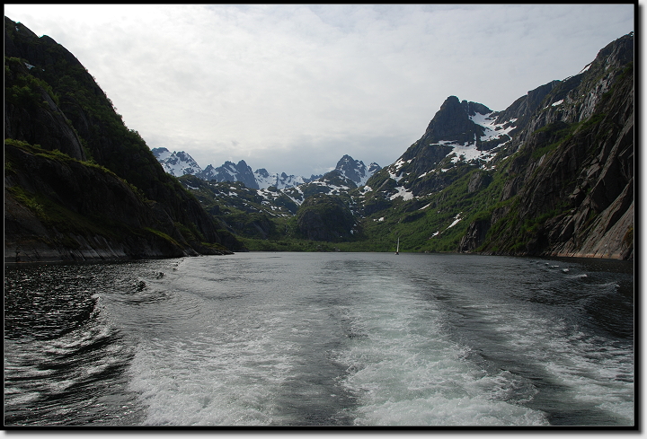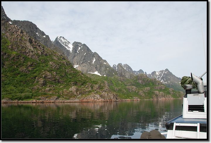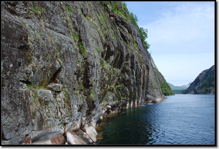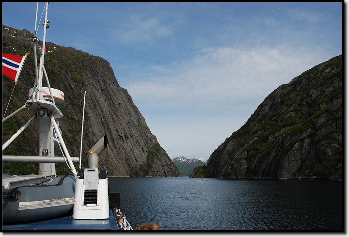Nach 1 ½ Stunden kamen wir am Ziel, dem Trollfjord, an. Die Einmündung des Fjords ist nur 100 Meter breit und erst dann weitet er sich bis zu einer Breite von 800 Metern. Hurtigrutenschiffe fahren in den Trollfjord rein und wenden an der breitesten Stelle. Das muss ein wirklich spektakuläres Manöver sein!