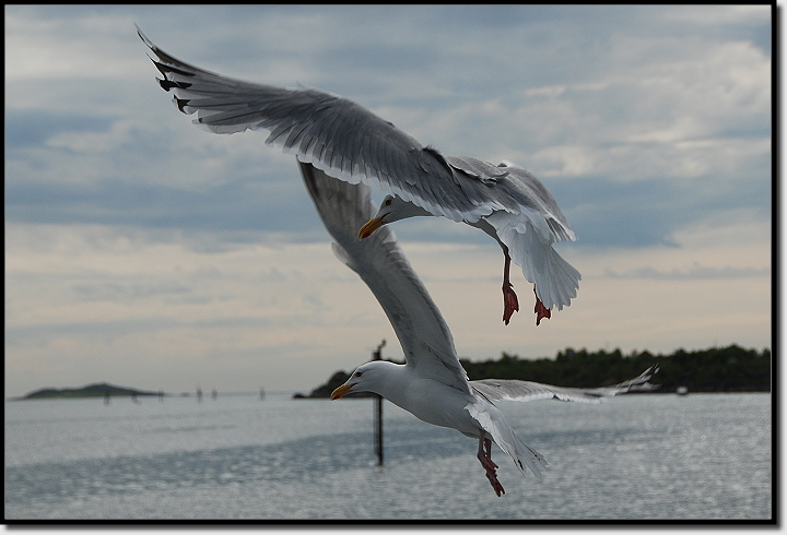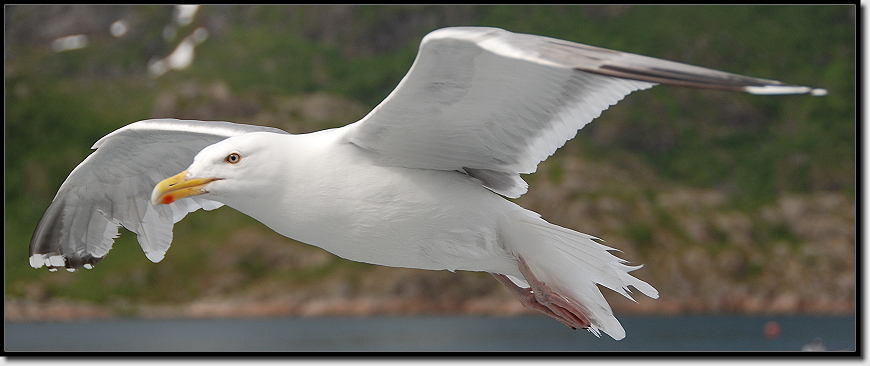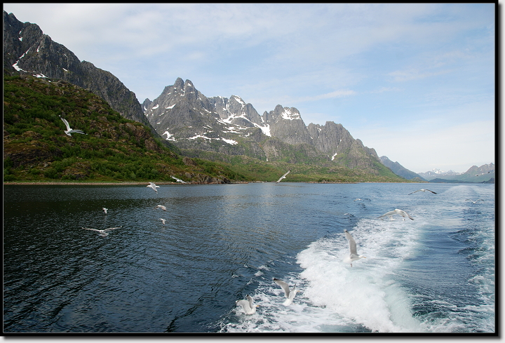 Nach einer langsamen Runde durch den Fjord, machten wir uns wieder auf den Rückweg. Ein Mann von der Besatzung fing irgendwann an, die Möwen mit Keksen zu füttern. Die nahmen das Futter natürlich sehr gerne an.