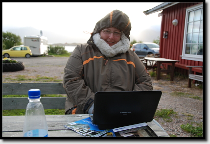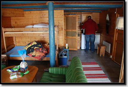 Nach 3-stündiger wirklich erlebnisreicher Tour kamen wir wieder im Hafen an. Noch etwas durchgefroren steuerten wir auf den nächsten Supermarkt zu und kauften Garnelen fürs Abendessen (29 Kronen; 3,85 € pro Kilo, ich glaube, wir essen nur noch Garnelen). Heute wollten wir etwas früher auf Unterkunftssuche gehen und fuhren schon gegen 17:20 Uhr den Campingplatz an. Aber dort gab es keine Hütten mehr, nur noch ein Zimmer mit Dusche und WC für 59,85 € (450 Kronen). Klar, so eine Hütte ist gemütlicher, aber für den Preis und mit eigenem Bad?! Nehmen wir. So zogen wir ins Kellergeschoss eines großen Holzhauses.