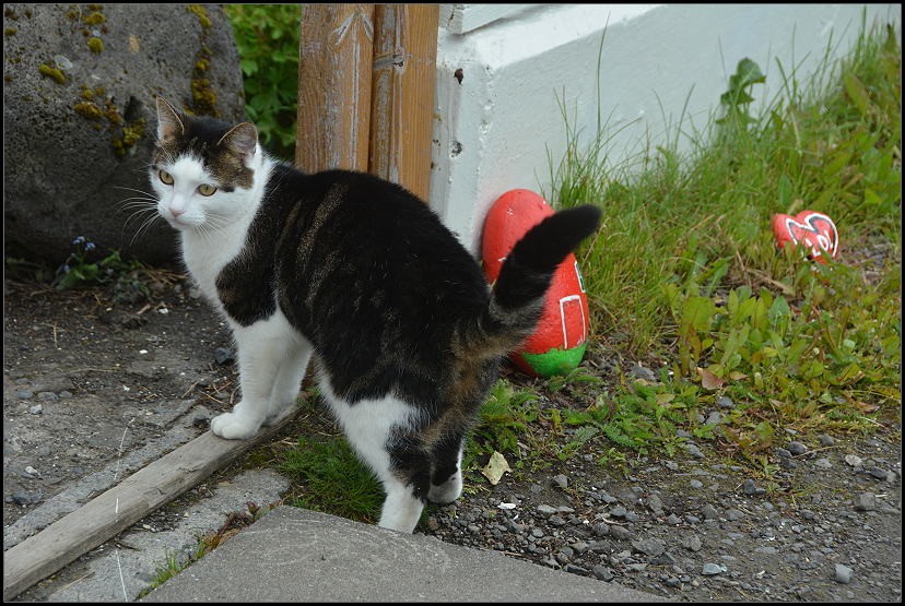 Vorbei an mit Lupinen bewachsenen Berghängen und am Strand liegenden Schafen fuhren wir nach Þingeyri. Im uriggemütlichen Café Simbahöllin ließen wir uns nieder und ich begutachtete erst mal meinen Arm. Da war doch tatsächlich ein Stich!! Das glaub ich jetzt nicht! Ich dachte, in Island gibt es keine Mücken die stechen??? Also, alles Blödsinn, was im Netz steht!!!