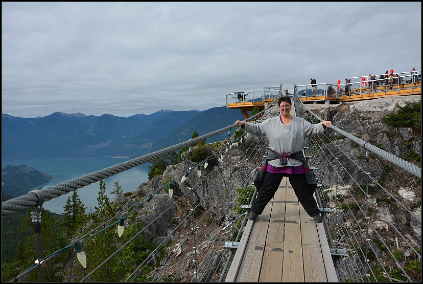 Oben gab es ein Restaurant mit verschiedenen Kleinigkeiten und einen traumhaften Ausblick auf den Howe Sound und die umliegende Bergwelt. Von dort aus gingen wir über die 90 Meter lange Suspension Bridge zu einer weiteren Aussichtsplattform.