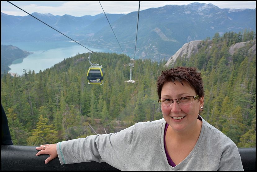 Direkt neben den Fällen liegt die „Sea-to-Sky-Gondola“. Da wir am Vortag ja Pech mit der Peak-to-Peak-Gondel hatten, wollte ich gerne mit dieser fahren. Tom tat mir den Gefallen und schnell stieg ich ein, bevor er es sich noch mal anders überlegte. Innerhalb von 8 Minuten brachte uns die Seilbahn auf 885 Meter.
