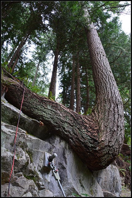 Dieser 46 Tonnen schwere Baum stürzte bei einem starken Wintersturm auf die schwingende Hängebrücke. Zum Glück hielt sie diesem Riesen stand und er konnte in mehrere Stücke gesägt werden. Nun liegt er am Wegesrand und kann bestaunt werden.