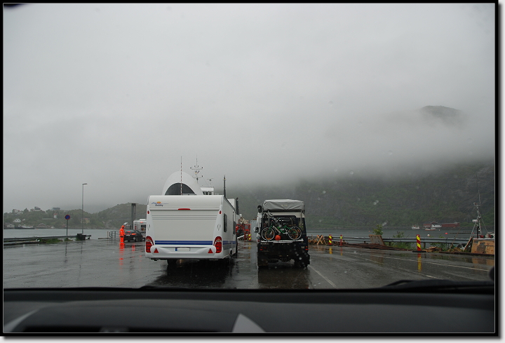Um 9:20 Uhr rollten wir los zum Fähranleger in Moskenes. Durch den Regen und die tief hängenden Wolken sah die Landschaft ein wenig trist aus. Besonders im Gegensatz zum vorherigen supersonnigen Tag.