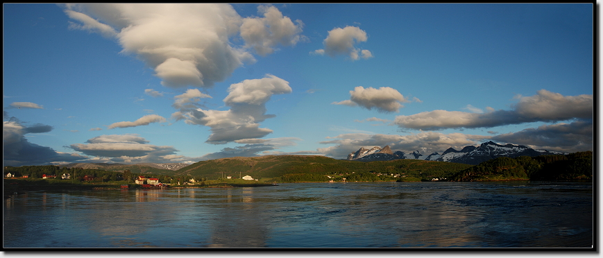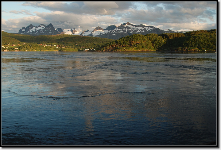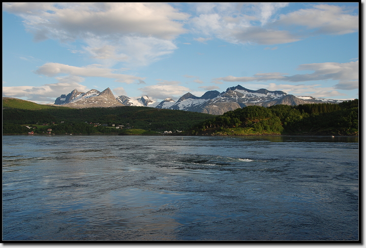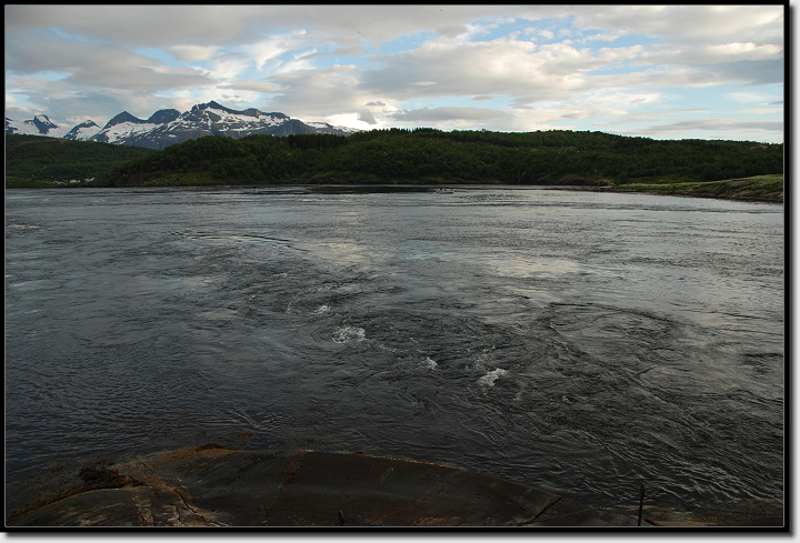 Nach dem Essen machten wir uns auf zum Saltstraumen, dem größten Gezeitenstrom der Welt. Etwa alle 6 Stunden zwängen sich fast 400 Millionen Kubikmeter Wasser durch eine 150 Meter breite Meerenge. Der Strom erreicht dabei eine Geschwindigkeit von bis zu 38 km/h.