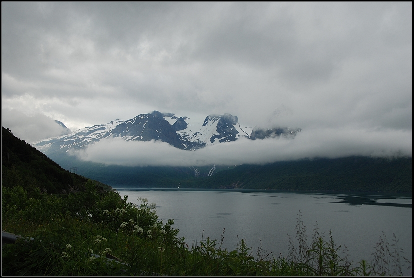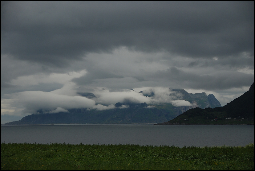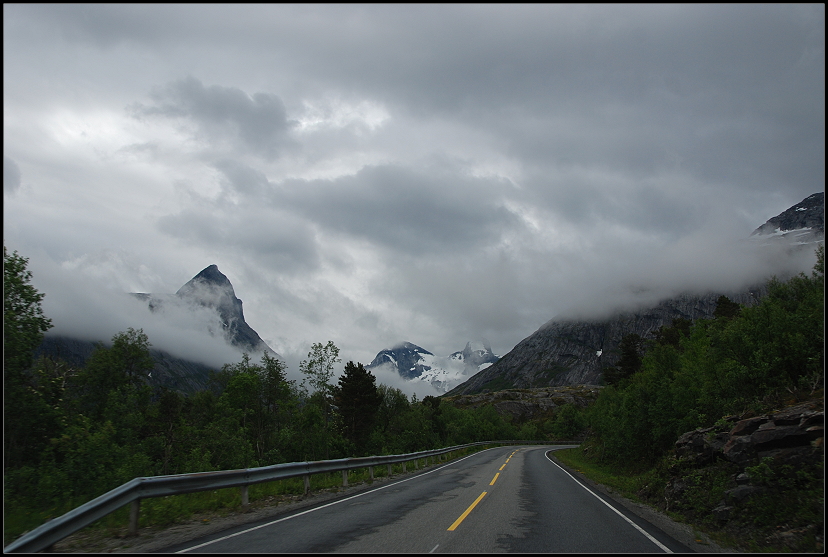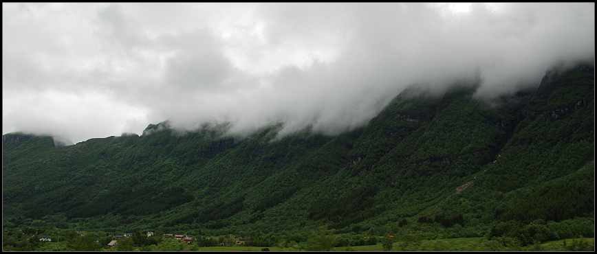 Die teilweise tief hängenden Wolken sahen mystisch aus und zogen langsam an den Berghängen entlang. Wir legten mal wieder ein Hörbuch ein, passend zur Landschaft „Ein Mann, ein Fjord“ von Hape Kerkeling.