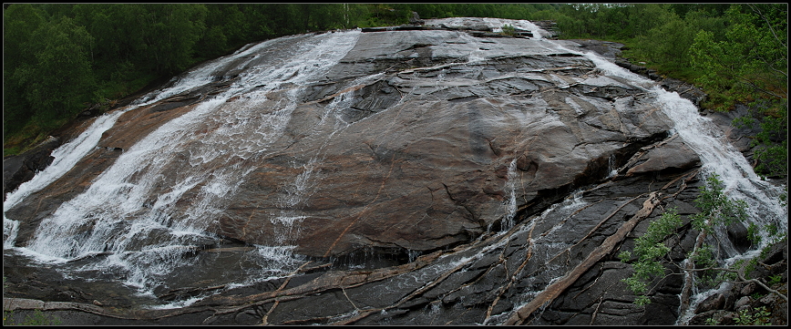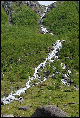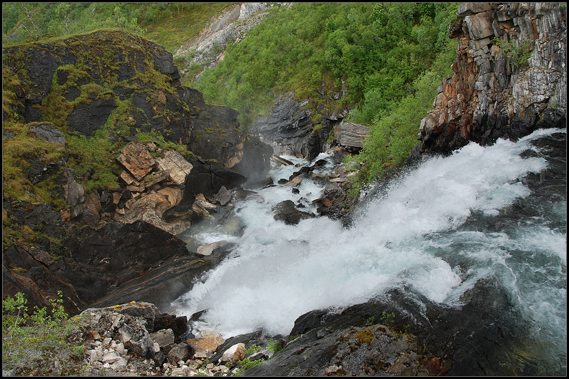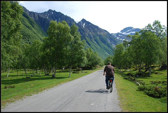 Dann ging es noch weiter bis zum Ende der Schotterpiste. Von dort aus konnte man die Felsen bis zum Eis hochklettern. Das hätte aber viel zu viel Zeit in Anspruch genommen. In drei Tagen mussten wir in Oslo sein und heute noch einige Kilometer auf der Straße zurücklegen. Ich machte also nur viele Bilder und wir radelten zurück.