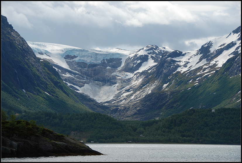 In Holand machten wir stopp. Denn von dort fuhren wir mit einem kleinen Bötchen über den Holandfjord. Oberhalb der Berggipfel erstreckt sich der zweitgrößte Gletscher Norwegens, der 370 km² große Svartisen.