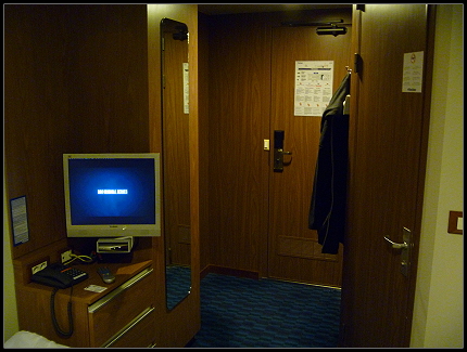 Wir schnappten uns unsere Taschen und gingen schnurstracks zu unserer Kabine auf Deck 9. Schick war die, keine Vergleich zu den Zellen auf den DFDS-Schiffen. Holzimitat und ein Bild an der Wand sorgten für Gemütlichkeit und Tom freute sich besonders über den Fernseher, der schon beim Betreten der Kabine lief.