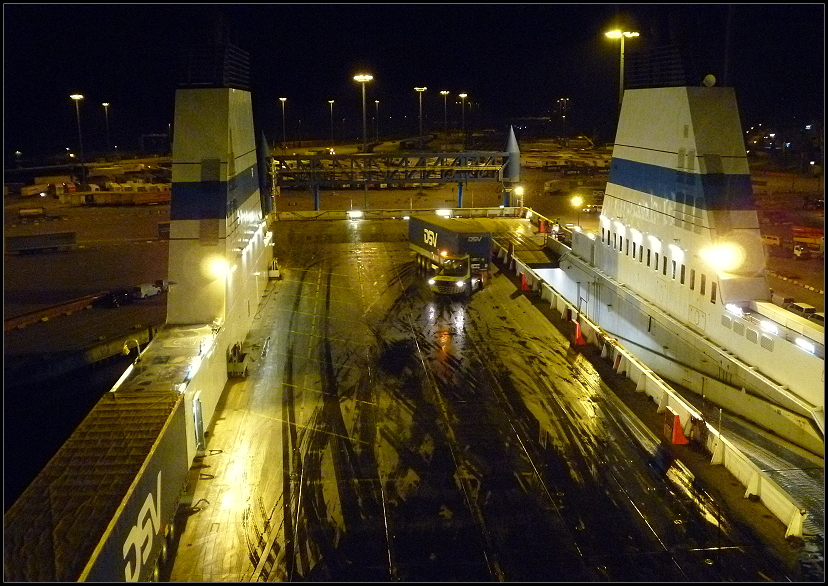 Schnell stellten wir unsere Sachen ab und gingen an Deck. Dort schauten wir eine Weile den Fahrern zu, die die Sattelauflieger mit viel Geschick an Bord rangierten. Die Jungs haben es echt drauf.