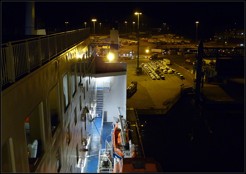 Die Zeit bis zum Boarding vertrieben wir uns mit einem Anruf daheim, Futtern der letzten Sandwiches und einem kurzen Toilettenbesuch. Abpfiff beim EM-Spiel, Deutschland hatte 1:2 gewonnen!!!! Pünktlich um 23:00 Uhr setzte sich der Autokonvoi in Bewegung und wir konnten auf die Fähre fahren. Sofort waren wir von ihrer Größe überrascht. Wie viele Decks es hier gab!! Die Besatzung hatte alles gut im Griff und schnell standen alle Fahrzeuge so, wie es sein sollte.