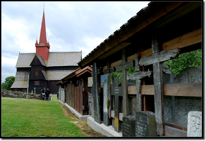 Wenn man mit der Nase ganz nah ans Holz geht, riecht man den typischen Stabkirchengeruch, den wir vor 9 Jahren auch in den Kirchen von Urnes und Borgund wahrgenommen hatten. Es riecht nach leicht verkokeltem Holz und Teer. Mit dem Teer wird die Kirche gestrichen und besonders auf der Nordseite, wo kaum Sonne hinkommt, sind sie daher tiefschwarz.