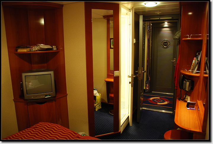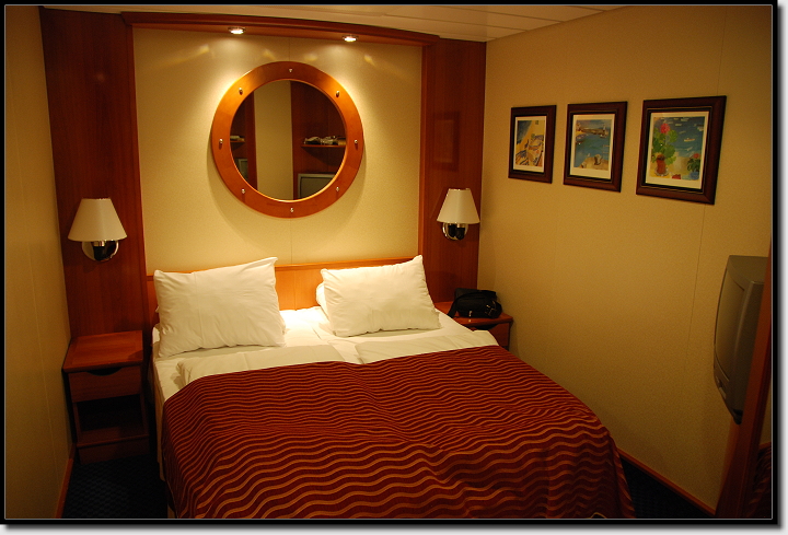 So gingen wir gegen 19:30 Uhr in die Kabine. Eigentlich wollten wir nur meinen Pulli holen, aber dann fing Tom an eine von unseren mitgebrachten Frikadellen zu essen und ich nahm mir den griechischen Salat. Wir hockten uns aufs Bett, mümmelten so vor uns hin und machten nebenbei den Fernseher an. Ich dachte, ich fang schon mal mit dem Reisebericht an, sonst wird das nix mehr. Gerade war ich bei der Mitte des Tages angekommen, da hörte ich ein leises Schnarchen neben mir. Na toll, jetzt wird das mit dem An-Deck-gehen nix mehr. Müde war ich aber auch und so befanden wir uns um 22:00 Uhr schon im Land der Träume.
