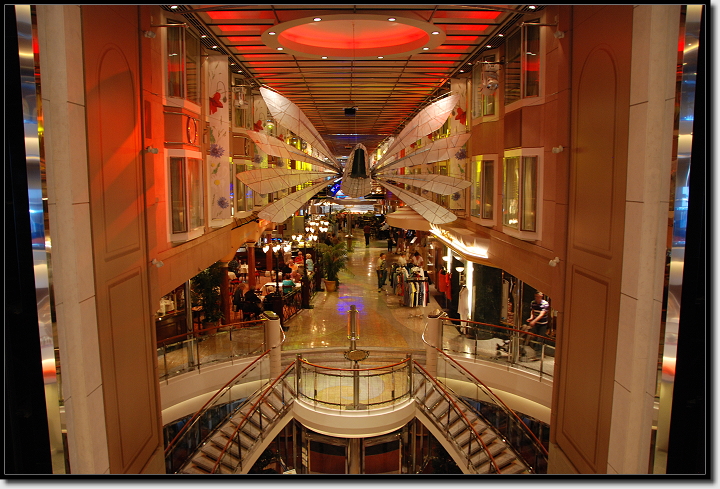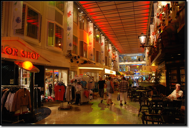 Gegen 15:30 Uhr wollten wir uns mal den Rest des Schiffes anschauen und fuhren mit einem gläsernen Aufzug auf Deck 7. Hier sah es aus, wie man es auf einem Kreuzfahrtschiff erwarten würde, aber doch nicht auf einer Fähre. Es gab ein richtiges Promenadendeck mit Restaurants und Geschäften. Eine Weile bummelten wir und schauten uns auch noch das Casino und das Theater an. Im Taxfree Market fanden wir tiefgefrorenes Rentiergulasch, welches ich gerne mitgenommen hätte. Aber Tom wollte nicht, er hatte sich in den Kopf gesetzt zu grillen, wenn wir wieder zu Hause sind. Schade, bis nach Hause wäre es angetaut gewesen und wir hätten es zeitnah machen müssen. Dann halt nicht.