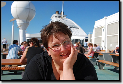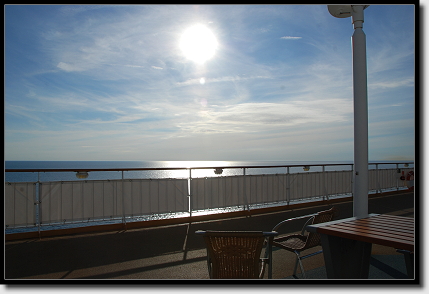 Danach suchten wir uns auf dem Sonnendeck ein nettes Plätzchen und genossen die Sonne. Das war ein schöner letzter Urlaubsabend. Ein Motorradfahrer aus Bayreuth gesellte sich zu uns und wir plauderten eine Weile. Als die Sonne schon recht tief stand, wurde mir langsam kalt.