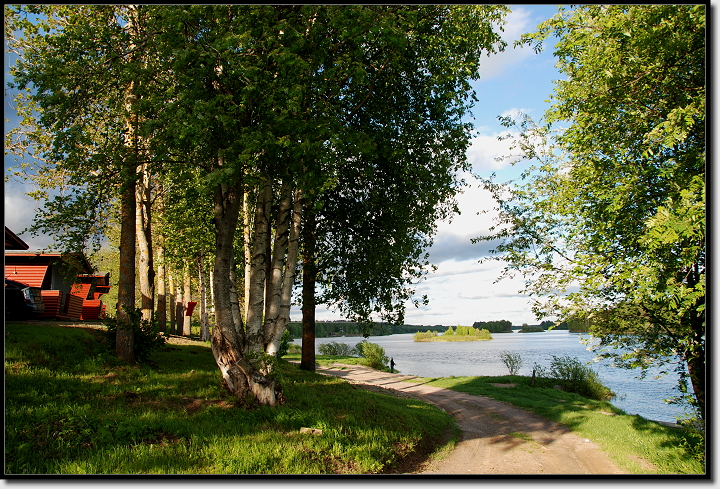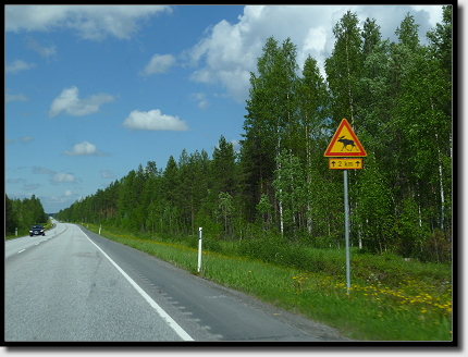 Am Straßenrand blühten Lupinen in den unterschiedlichsten Farben und Wälder wechselten sich mit großen und kleinen Seen ab. Die Straße führte schnurstracks geradeaus und immer wieder standen Elch-Warn-Schilder am Rand. Genauso hatten wir uns Finnland vorgestellt. Unser Navi wies uns den Weg, in 110 Kilometern im Kreisverkehr geradeaus…