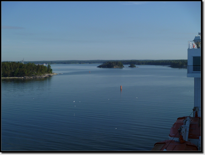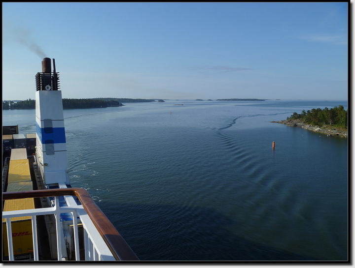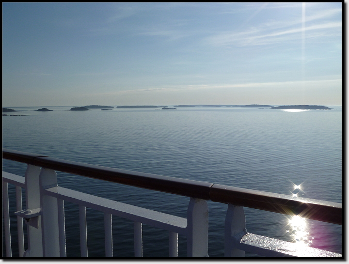 Wir mümmelten an unseren Brötchen und schlürften Tee und Kaffee. Draußen konnten wir kleine Inseln vorbeiziehen sehen und auch eine der AIDA´s fuhr an uns vorbei. Es wurde Zeit, ich wollte an Deck und Bilder machen. In der Morgensonne hielten wir es ohne Jacken aus, es wehte auch kaum ein Lüftchen.