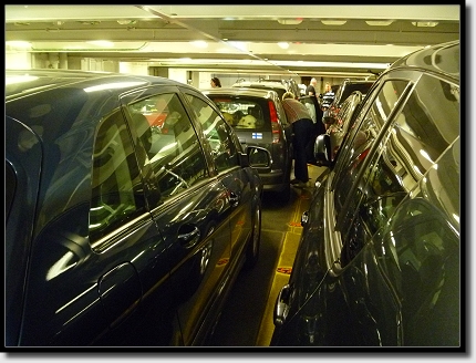 Als der Hafen immer näher rückte, gingen wir zurück zur Kabine und packten die restlichen Sachen zusammen. Noch ein schneller Gang zur Toilette und wir gingen vollgepackt zum Autodeck Nr. 8. Das war auch ganz schön vollgepackt.