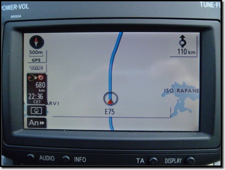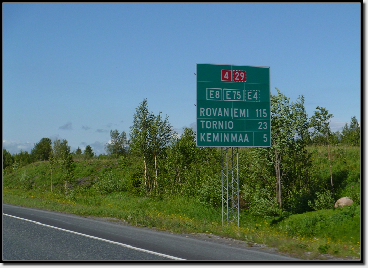 Um kurz vor 9:00 Uhr fuhren wir dann endlich von der Fähre runter. Ruckzuck passierten wir die Passkontrolle und fuhren erst mal einem PKW mit deutschem Kennzeichen hinterher, weil unser Navi sich noch nicht auf Finnland eingestellt hatte. Nach ein paar hundert Metern hatte es sich „eingelebt“ und wies uns den Weg nach Rovaniemi. Allerdings zeigte es 15 Stunden bis zum Ziel an!!! Das war viel zu viel, der Routenplaner daheim rechnete für die Strecke nur 10,5 Stunden!? Nun gut, die CD im Navi ist schon ein paar Jahre alt und vielleicht gibt es jetzt Straßen, die es damals noch nicht gab?! Wer weiß… Wir machten uns einfach mal auf den Weg.