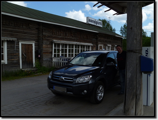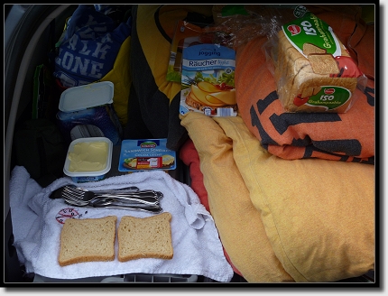 Genau 367 km von Helsinki entfernt, stoppten wir an einem kleinen Supermarkt und kauften etwas Toast für unser Mittagessen. Im Kofferraum auf unserer neuen Kühlbox schmierte ich dann ein paar Sandwiches, die wir uns unterwegs schmecken ließen.