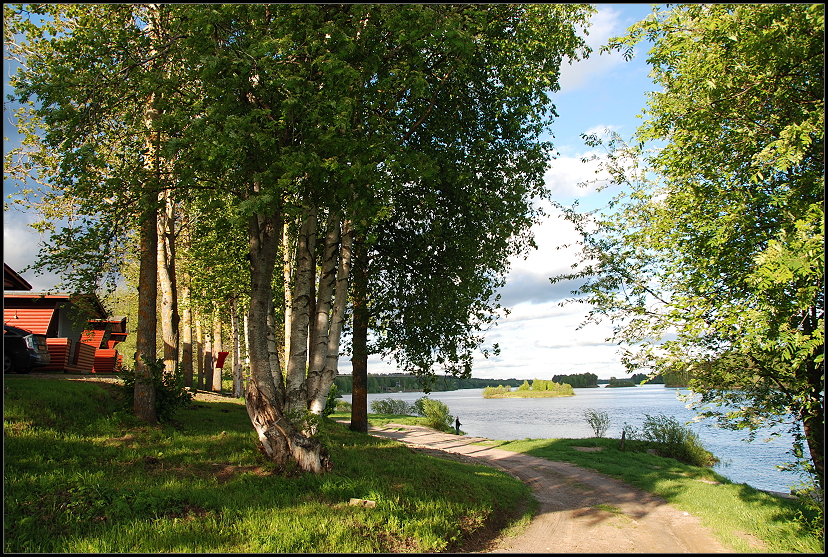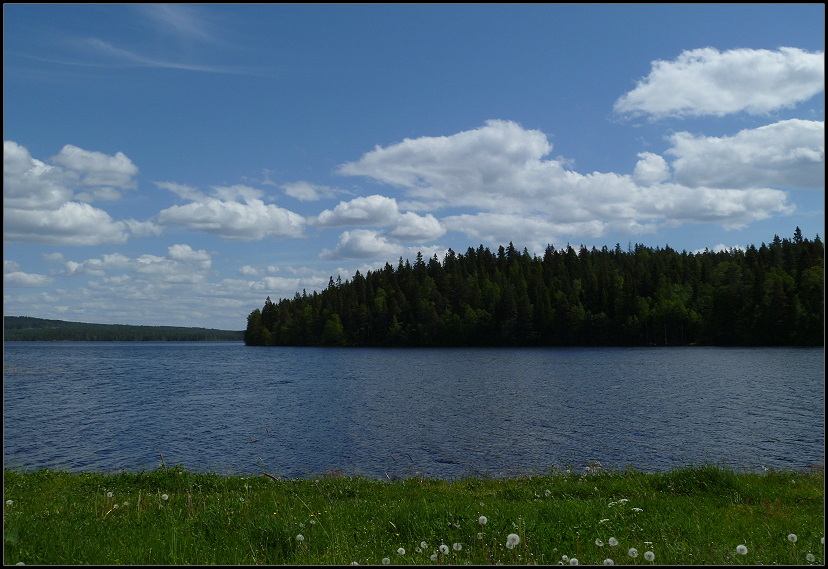 Am Straßenrand blühten Lupinen in den unterschiedlichsten Farben und Wälder wechselten sich mit großen und kleinen Seen ab. Die Straße führte schnurstracks geradeaus und immer wieder standen Elch-Warn-Schilder am Rand. Genauso hatten wir uns Finnland vorgestellt. Unser Navi wies uns den Weg, in 110 Kilometern im Kreisverkehr geradeaus…
