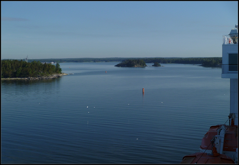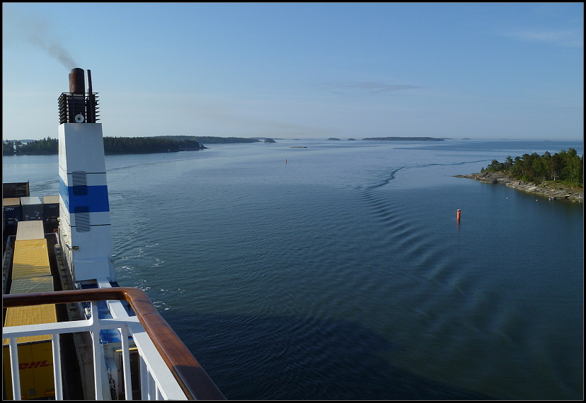 Wir mümmelten an unseren Brötchen und schlürften Tee und Kaffee. Draußen konnten wir kleine Inseln vorbeiziehen sehen und auch eine der AIDA´s fuhr an uns vorbei. Es wurde Zeit, ich wollte an Deck und Bilder machen. In der Morgensonne hielten wir es ohne Jacken aus, es wehte auch kaum ein Lüftchen.