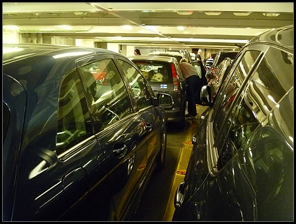 Als der Hafen immer näher rückte, gingen wir zurück zur Kabine und packten die restlichen Sachen zusammen. Noch ein schneller Gang zur Toilette und wir gingen vollgepackt zum Autodeck Nr. 8. Das war auch ganz schön vollgepackt.