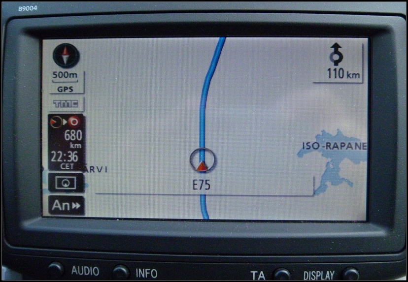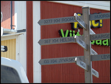 Um kurz vor 9:00 Uhr fuhren wir dann endlich von der Fähre runter. Ruckzuck passierten wir die Passkontrolle und fuhren erst mal einem PKW mit deutschem Kennzeichen hinterher, weil unser Navi sich noch nicht auf Finnland eingestellt hatte. Nach ein paar hundert Metern hatte es sich „eingelebt“ und wies uns den Weg nach Rovaniemi. Allerdings zeigte es 15 Stunden bis zum Ziel an!!! Das war viel zu viel, der Routenplaner daheim rechnete für die Strecke nur 10,5 Stunden!? Nun gut, die CD im Navi ist schon ein paar Jahre alt und vielleicht gibt es jetzt Straßen, die es damals noch nicht gab?! Wer weiß… Wir machten uns einfach mal auf den Weg.